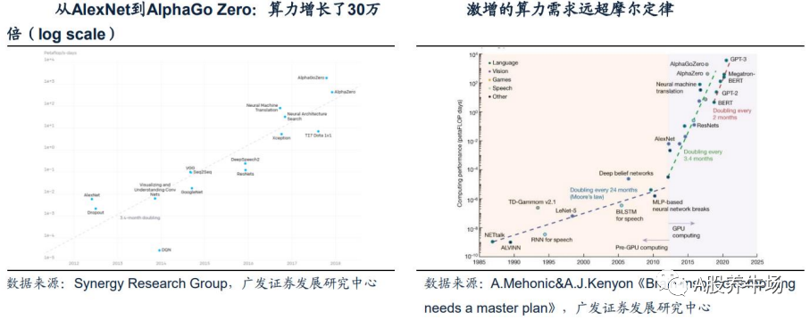 而摩尔定律认为,芯片计算性能大约每18-24个月翻一番。因此,AI训练模型算力需求增长与芯片计算性能增长之间的不匹配,或将带来对算力基础设施供给需求的快速增长。