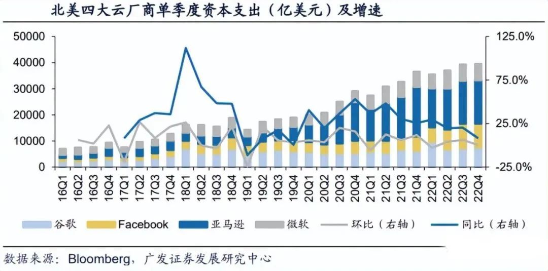 北美云厂商资本支出向技术基础设施和新数据中心架构倾斜。22Q4亚马逊资本支出主要用于技术基础设施的投资,其中大部分用于支持AWS业务增长与支持履行网络的额外能力。