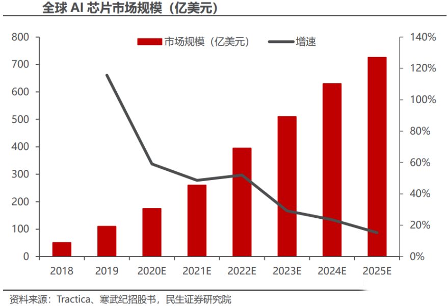根据Tractica、寒武纪招股书相关数据,全球人工智能芯片2022年市场规模预计约395亿美金,预计到2025年将达到726亿美金,年复合增长率达到22%。