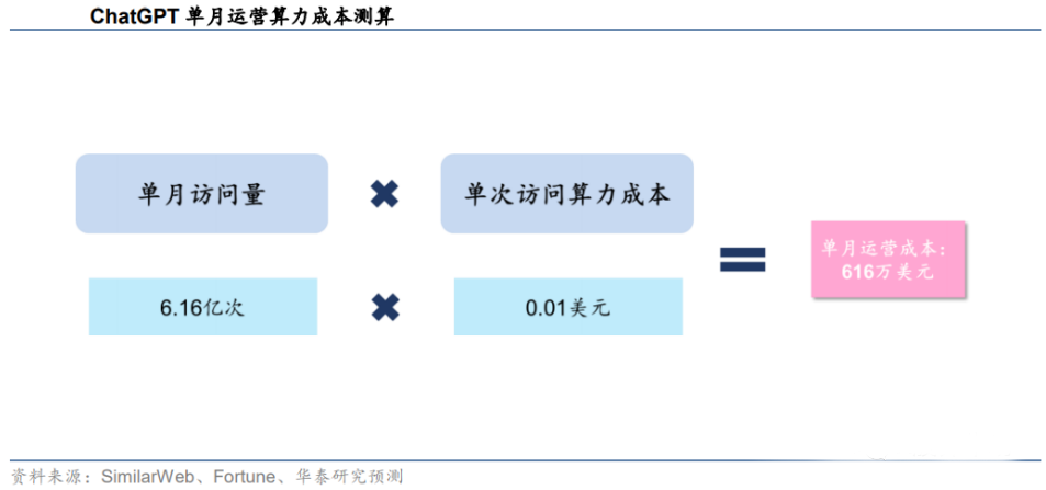据SimilarWeb数据,2023年1月ChatGPT官网总访问量为6.16亿次。据Fortune杂志,每次用户与ChatGPT互动,产生的算力云服务成本约0.01美元。
