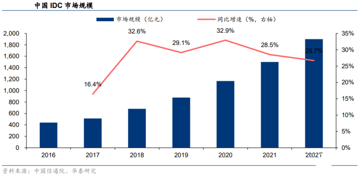 AI训练需求有望带动IDC市场规模快速增长。据中国信通院,2021年国内IDC市场规模1500.2亿元,同比增长28.5%。随着我国各地区、各行业数字化转型深入推进、AI训练需求持续增长、智能终端实时计算需求增长,2022年国内市场规模达1900.7亿元,同增26.7%。