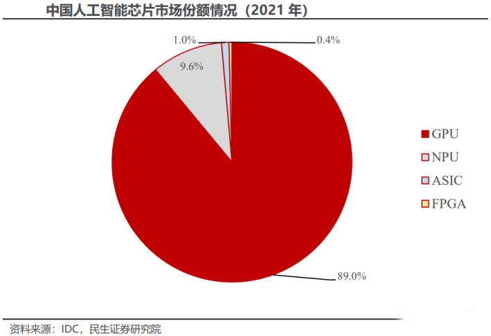 2021年国内仍以GPU为主实现数据中心计算加速。根据IDC数据,2021年中国人工智能芯片市场中,GPU的市场占有率近90%,ASIC,FPGA,NPU等非GPU芯片市场占有率超过10%。
