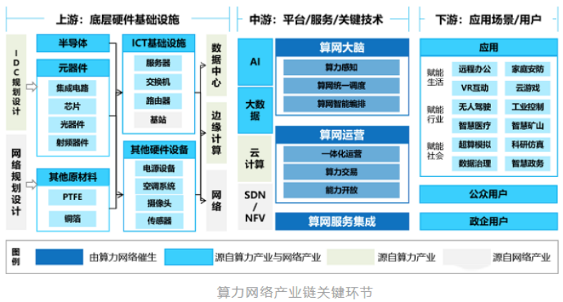 随着信息通信技术从云网融合向算网一体迈进,算力和网络产业的边界日益模糊,形成以“算+网+协同”为主线的算力网络产业格局,上游为底层硬件基础设施,中游为算力网络相关平台、服务及关键技术,下游为赋能的应用场景及最终用户,产业链关键环节如下图所示。