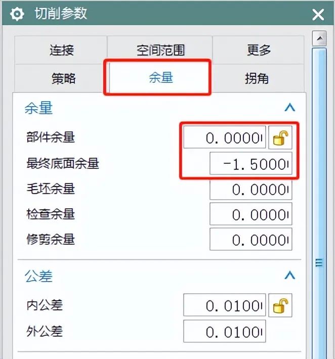 4、余量设置与平面倒角方法1略有不同,在【切削参数】——【余量】,侧壁余量为0,底余量为比倒角大小大-0.5-1MM左右,如下图: