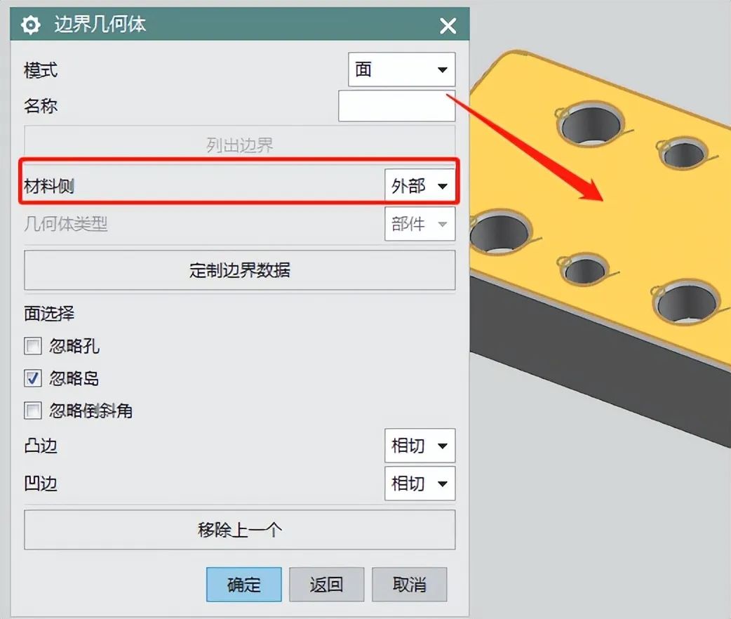 2、选择要倒角后的边界,指定边界用面的边,材料侧为外部,如下图: