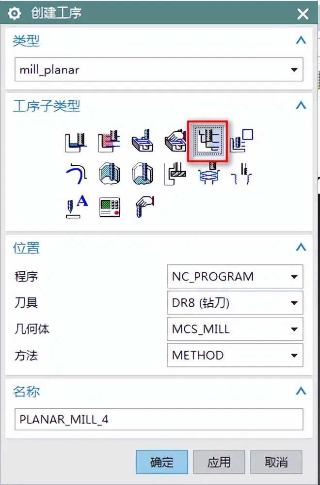 1、首先创建2D加工策略,【插入】——【 工序】——【mill_planr】——【2D平面铣】,如下图: