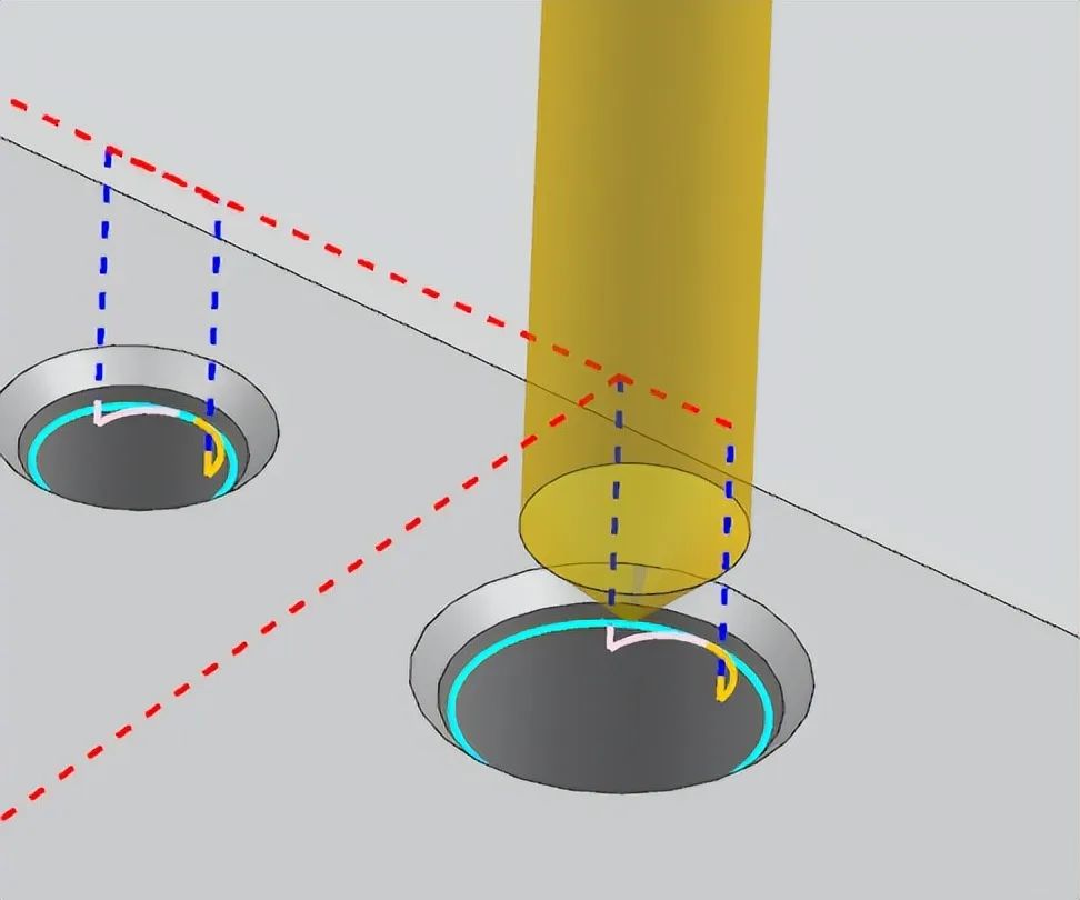 5、定义一把D8倒角刀,切削模式为轮廓加工,进退采用圆弧进退刀,并生成倒角刀路,如下图所示: