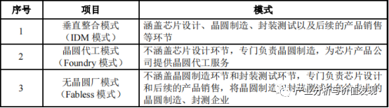 根据所包含的生产环节的不同,半导体产业的企业经营模式一般可分为垂直整合模式(IDM 模式)、晶圆代工模式(Foundry 模式)和无晶圆厂模式(Fabless模式),发行人属于晶圆代工模式。