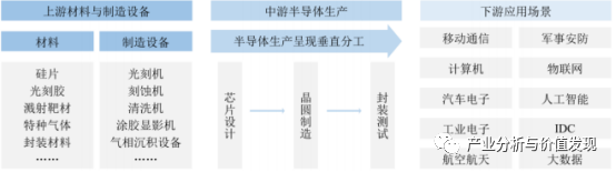 半导体是常温下导电性能介于导体与绝缘体之间的材料,由其制成的器件统称半导体产品。半导体行业呈现垂直化分工格局,上游包括半导体材料、半导体制造设备等;中游为半导体生产,具体可划分为芯片设计、晶圆制造、封装测试;半导体产业下游为各类终端应用,被广泛地应用于电子通信、计算机、网络技术、物联网、汽车等产业是绝大多数电子设备的核心组成部分。