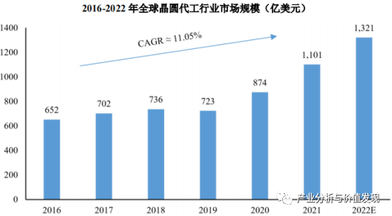 晶圆代工行业源于半导体产业链的专业化分工,晶圆代工企业不涵盖芯片设计环节,专门负责晶圆制造,为芯片产品公司提供晶圆代工服务。根据 IC Insights 的统计,2016 年至 2021 年,全球晶圆代工市场规模从 652亿美元增长至 1,101 亿美元,年均复合增长率为 11.05%。未来随着新能源汽车、工业智造、新一代移动通讯、新能源及数据中心等市场的发展与相关技术的升级,预计全球晶圆代工行业市场规模将进一步增长。