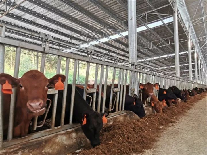 高大宽敞的牛圈里,一排排整齐的牛栏,一行行溢满的食槽,一头头肥壮的肉牛……诺大的养牛场,草料加工、安全检查、精细喂养井然有序。