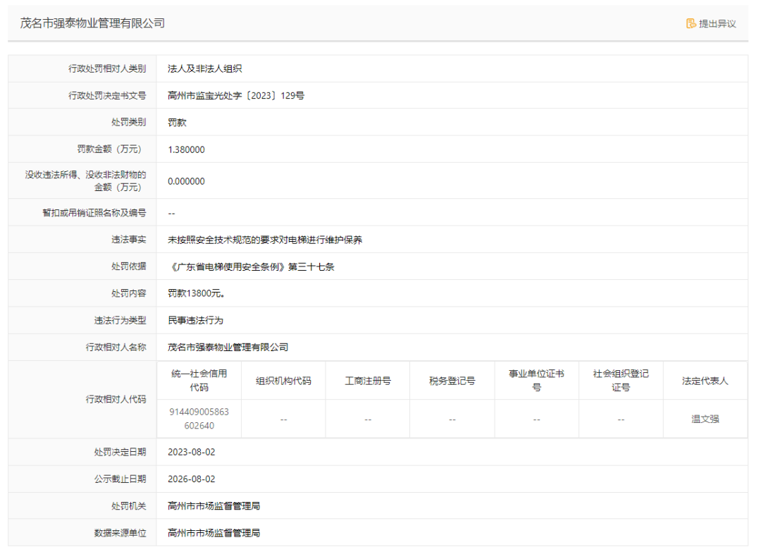 茂名:某物业公司被罚款13800元