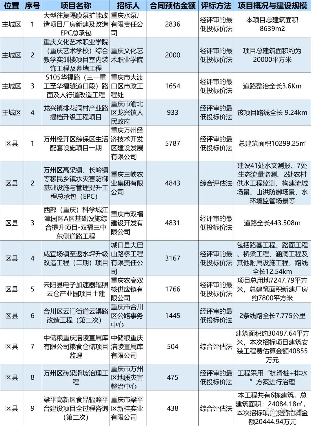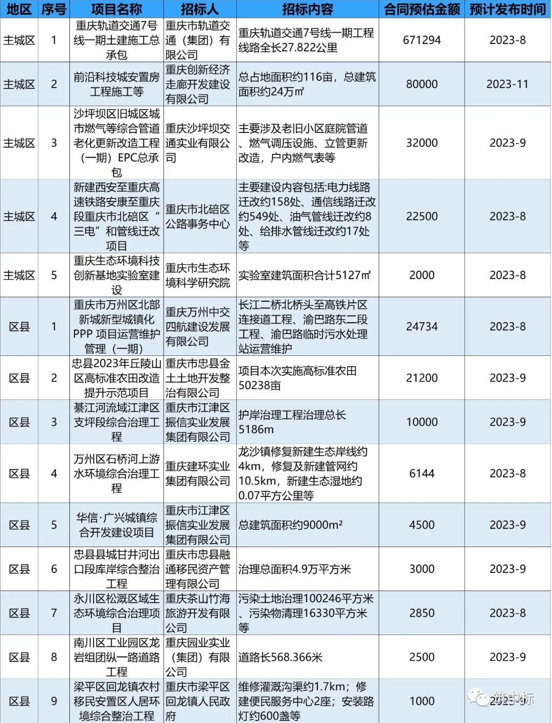 今天是2023年8月7日,下面是最新的工程建设类招标计划简讯,招标计划全市总计14条,主城区5条,周边区县9条。项目合同预估金额大于1亿的有7个,主城区4个,区县3个。1000万-1亿的有7个,主城区1个,区县6个。下面是最新的工程建设类招标公告简讯,招标公告信息全市总计13条,主城区4条,周边区县9条。项目合同预估金额大于1亿的有0个,主城区0个,区县0个。1000万-1亿的有9个,主城区3个,区县6个。其中采用“综合评估法”的项目有3个,采用“经评审的最低价投标法”的项目有10个。下面是最新的工程建设类中标候选人公示简讯,中标候选人公示信息全市总计13条,主城区3条,周边区县10条。
