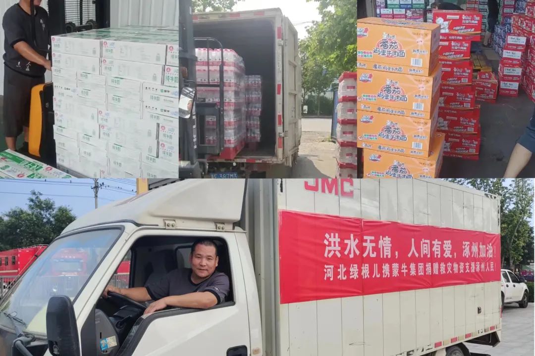 8月2日,四辆满载着牛奶、矿泉水、方便面等物资的货车,从天津、保定等不同方向向涿州疾驰。这是由蒙牛和河北绿根儿配餐服务有限公司共同紧急筹措的抗灾物资。当天下午17时许,慰问小组和车队抵达涿州市双语学校,在当地教育系统员工的配合下,快速将物资摆放在指定位置,向奋战在抗洪一线的涿州人民送上慰问和关心。