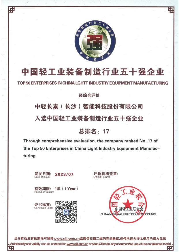 喜报|中轻长泰再次入选中国轻工业装备制造行业五十强企业榜单
