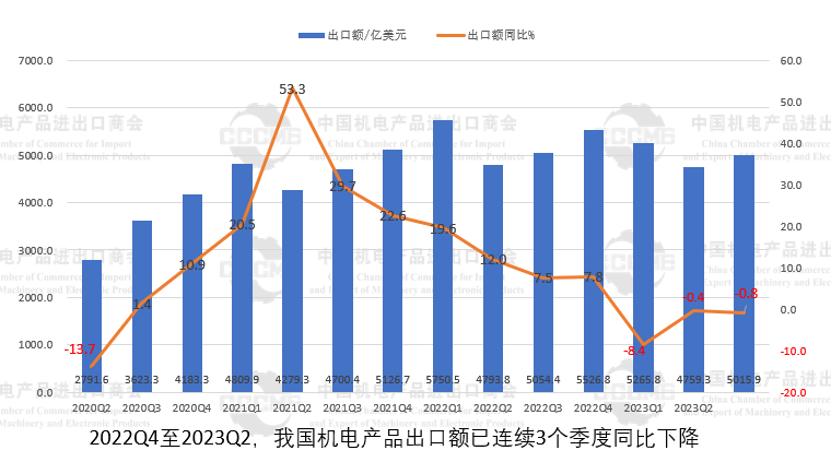 6月当月,我国机电产品出口1667.6亿美元,同比下降5.7%,降幅较上月扩大4.4个百分点;进口808.7亿美元,同比下降7%,连续第16个月同比减少。