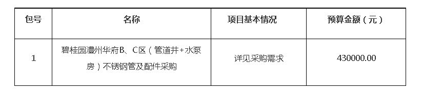 澧县城区供水有限公司的碧桂园澧州华府B、C区(管道井+水泵房)不锈钢管及配件采购项目进行竞争性磋商采购,现采用发布邀请公告的方式,邀请符合资格条件的供应商参与竞争性磋商采购活动。