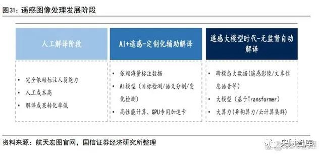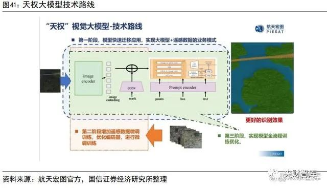 AI 大模型驱动了空天信息产业的发展,通用性遥感大模型技术成为一种必然趋势。遥感图像解译工作正逐步迈向遥感大模型阶段,特别是随着SAM 大模型的推出。与此前受限于人工成本和模型泛化能力不足的传统方法相比,大模型展现出对遥感图像进行统一的分割、识别和生成的潜力,从而极大提升解译效率。此外,在目标检测和要素分割领域,大模型展现出了显著的鲁棒性,有效地降低了工作量。效率的增加、工作量的减少也为下游遥感应用的拓展带来益处,如地球环境检测、特种领域地形构建等。 航天宏图发布天权大模型,可应用于多个领域。天权遥感大模型结合了CV和NLP技术,专为遥感解译设计,如光学遥感、光谱数据、SAR 雷达和无人机数据等多种类型的遥感数据。经过多阶段的开发和优化,其功能强大,能够交互式自动提取分割图像,增强样本标注业务,提高模型的通用识别能力以及能够自动学习生成物体。此外,未来还将推出 PIE-Engine studio,实现代码的自动生成。基于“天权”大模型的智能问答应用是面向遥感领域的人机对话协作系统,提供感知交互式的知识检索和内容生成能力,赋能国防安全、应急管理、交通水利、国土资源等多个领域。 中科星图推出空天灵眸大模型,构建第二增长曲线。中科星图与空天院成功联手研发了名为“空天灵眸”的大模型。这一模型是基于transformer 算法和自监督训练机制构建的。作为一个基座模型,空天灵眸可以通过下游的微调(fine-tuning)实现更广泛的应用发展。例如,利用 dataplog 的数据基础,它能够在全国范围内精确提取建筑物的轮廓和高度,进一步实现精细化的土地分类。该大模型极好地融合了数据和算力,因此在公开的数据集上已取得了令人满意的成果。此外,中科星图正积极投身于在线数字地球业务,利用云服务模式迅速扩展,并推出了“GEOVIS Earth 星图地球”系列产品。这成功构建了第二增长曲线,不仅标志着公司业务的线上化转型,还拓展到了教育、文旅等新的应用领域。(本文仅供参考,不代表我们的任何投资建议。如需使用相关信息,请参阅报告原文。) - End - 本文主编BAG-
