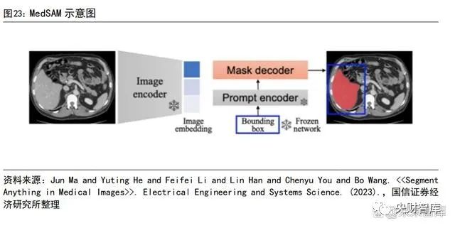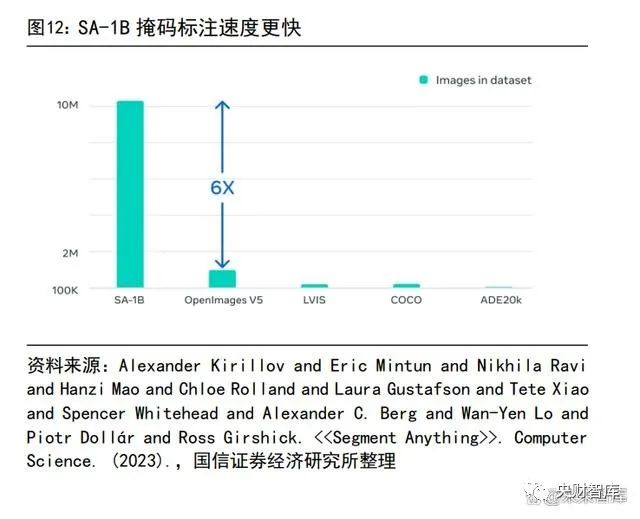 SAM 模型是一种高效且准确的图像分割模型,其应用能够为计算机视觉相关的行业和赛道提供更快和更准确的图像指示识别能力。根据应用难度的不同,可以将SAM 的应用落地区分为以下三个方面: 首先是工业机器视觉。在这个行业中,图像识别与处理已经得到了广泛的应用。SAM 模型的赋能可以带来降本增效,可以大大缩短训练时间和减少对数据的依赖。其次是 AR/CR 行业、自动驾驶、安防监控等赛道,需要捕捉和分割动态图像,基于 3D 重建等、对技术、算力的要求较高。且可能涉及数据、算法的伦理与隐私问题,应用落地需要一定时间;此外,SAM 也有分割任务实现较为困难的场景,在这方面SAM 衍生模型的发展突破,后续将能对遥感,医学影像处理产业带来巨大推推动。如:(1)医学图像具有多样的模态、低对比度、噪声干扰等特点。SAM 可以通过简单的微调来适应通用的医学图像分割,或通过输入提示来实现特定医学目标分割;(2)阴影检测和伪装物体分割任务涉及微小的视觉线索且背景复杂,对于SAM比较困难的。因此,SAM 可以通过利用少量标注数据,few-shot 训练一个适配器模块,来调整其输出,从而改善其分割效果,应用于遥感图像、农业等领域。最后,SAM 还可以作为基础模型,与其他模型或系统结合:例如SAM 可以与一个分类器结合,实现对任意图像中的所有物体进行检测和识别;或者与一个生成器结合,实现对任意图像中的任意物体进行编辑和转换等。这种结合能够提高图像识别和分割的准确性和效率,为不同行业带来更多应用场景。基于 3D 重建,赋能 AR、游戏在 AR/VR 领域,SAM 模型可以基于 3D 重建技术,为用户提供更加沉浸式的视觉体验。通过该模型,用户可以根据自己的目光选择一个物体,并将其转化为3D空间中的实体物体。 具体来说,SAM 模型结合了 3D 重建技术和图像处理算法,能够将2D 图像转化为3D 场景,从而实现对真实世界的还原和模拟。用户可以通过AR 或VR 设备观察和操控这些 3D 场景中的物件,享受高度沉浸式的互动体验。此外,SAM 模型还能够通过深度学习算法,对用户的视线和手势进行识别和跟踪,实现更加智能化的互动方式。例如,当用户注视某个物体时,SAM 可以自动聚焦并为其提供更加详细的信息。同时,当用户做出手势操作时,SAM 也能够快速响应并实现对场景的调整和变化。 总之,SAM 模型基于 3D 重建技术的应用赋能了 AR 和游戏等领域,为用户提供了更加沉浸式和智能化的虚拟体验。随着技术的不断进步和应用场景的不断扩展,SAM 模型在未来将会有更加广泛的应用前景。跟踪运动物体,赋能安防监控SAM 是一种高效且准确的图像分割模型,其能力在视频和动态图像分割方面得到了强化,并衍生出了 SEEM 和 SAM-Track 两种应用。这些衍生模型充分借鉴了SAM的零样本泛化能力,使得使用参考图像及用户输入的涂鸦、文字等信息,在模糊或者剧烈变形的视频中也可以准确地分割参考对象。如图 29 所示,SEEM 可以在跑酷、运动和游戏等视频中准确分割指定对象。对于这些运动场景的视频,传统的图像分割算法难以处理,因为场景中存在着复杂的背景和快速移动的目标物体。但是,SEEM 模型不仅可以准确地识别参考对象,还可以消除背景干扰,从而提高分割的精度。该功能除了在运动场景中体现之外,还可赋能安防、视频监控等赛道。在这些领域中,需要实现对视频中的物体进行精确分割,以便进行后续的识别和处理。SEEM和 SAM-Track 可以通过输入提示准确判断目标物体,并进行精确分割。这种分割功能可以为安防、视频监控等领域带来更高效、准确和智能化的处理能力。综上所述,SAM 及其衍生的 SEEM 和 SAM-Track 模型具有强大的视频和动态图像分割功能,并能够在运动场景、安防、视频监控等领域发挥重要作用。随着技术的不断进步和应用场景的扩展,这些模型在未来将会有更加广泛的应用前景。解决长尾难题,赋能自动驾驶在自动驾驶领域中,技术上的长尾问题是当前自动驾驶商业化进程中的主要制约因素。虽然现有技术已经实现了 90%以上道路场景的自动驾驶,但由于路面环境和车辆行驶情况的不可预测性,剩下 10%的长尾场景依然存在很大难度。这些长尾场景通常涉及到突发事件、复杂地形或气候条件等极端情况,例如强烈的降雨、暴风雪、雷电等,这些情况会对自动驾驶系统的识别和决策能力产生很大挑战。此外,在城市交通中,还有一些特殊情况需要考虑,如非机动车、行人和建筑物等存在的影响,这些都增加了自动驾驶系统的复杂度和难度。长尾场景如果不得到解决,自动驾驶就始终无法落地。为了解决长尾问题,自动驾驶技术需要集成更多的算法和传感器,并通过数据采集和深度学习等手段提高系统的智能水平。例如,可以结合雷达、摄像头、激光雷达等传感器进行数据融合,提高目标物体的识别和跟踪能力,同时可以通过深度学习算法实现对复杂场景的模拟和预测。此外,也可以引入人工智能技术,让自动驾驶系统在长尾场景中不断学习和优化,以提高其适应性和泛化能力。在自动驾驶领域中,SAM 可以用于对车辆行驶过程中的图像进行分割,以标注出图像中的不同物体和区域。自动驾驶系统需要实时地对路面情况进行感知,以便做出合适的决策。因此,对道路标记、车道线、行人、交通信号灯等物体和区域进行准确的标注非常重要。 传统的手动标注方法需