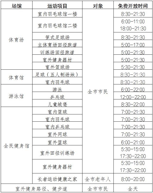 为深入实施全民健身国家战略,推动运动友好型城市建设,倡导市民积极参与体育锻炼,8月8日当天,全市大型公共体育场馆将面向市民免费开放,部分社会体育场馆也将免费或低收费开放。
