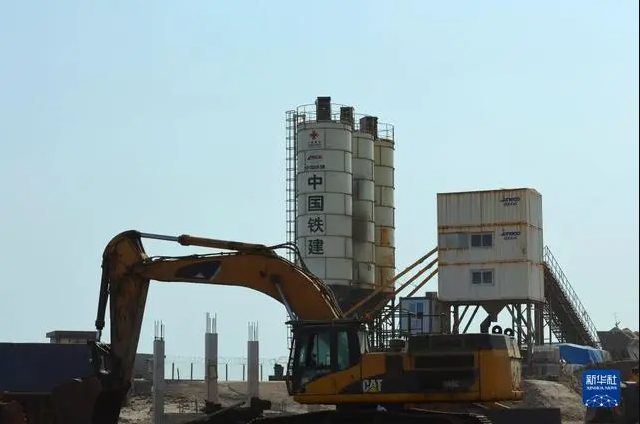 在加纳首都阿克拉,挖掘机在中国援建加纳渔港综合设施项目施工现场作业。