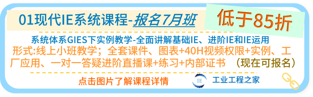 IE的系统体系、布局规划、标准工时、IE系列参数、线平衡、成本分析以及各种IE方法等在我们的现代IE系统课程-7月班级中都有系统和详细的案例讲解。现在可以报名,报名后即开通全套课件、图表、40H知识讲解视频权限等(新版本),还有16次进阶直播课(实例、应用、答疑等)。
