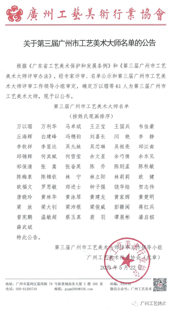 2023年5月,经前期专家评审、名单公示和第三届广州市工艺美术大师评审工作领导小组审定,万以琚等61人被确定为第三届广州市工艺美术大师。