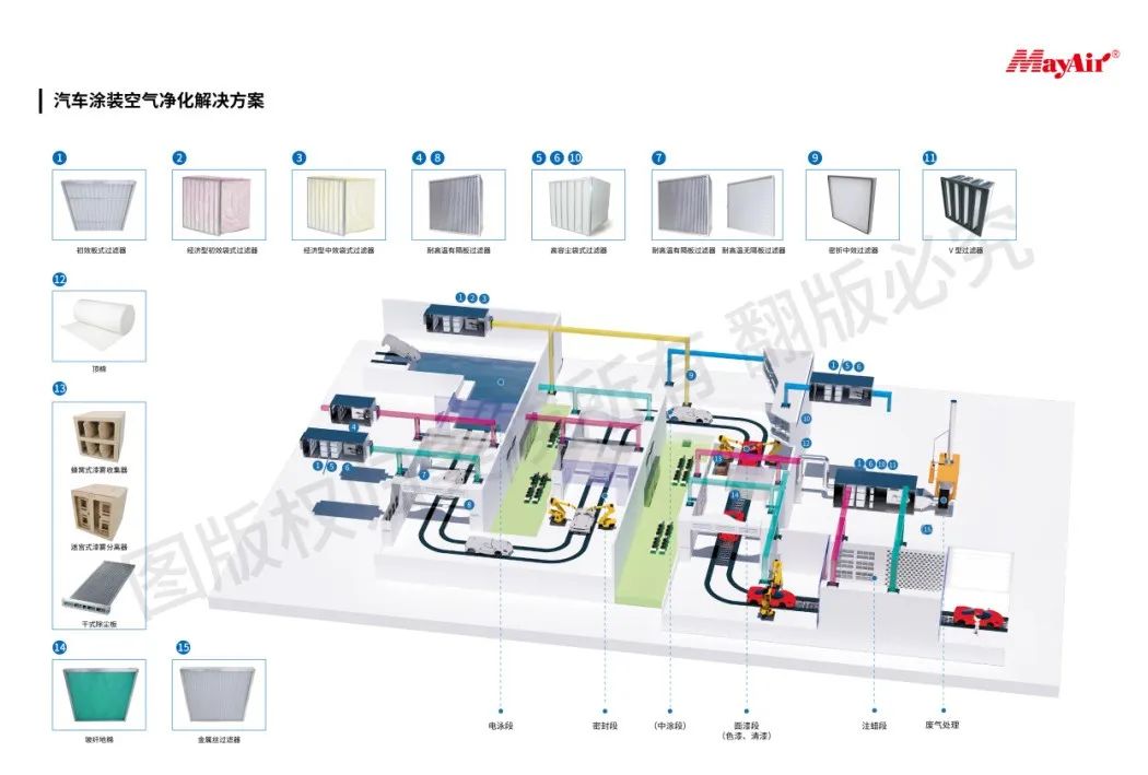 针对不同涂装工艺段,美埃科技可提供针对性的解决方案,所有的产品均符合涂装行业的特定要求,包括:不含硅酮、材料的阻燃性能等。美埃将涂装车间根据功能区分为厂房送风、工艺通风、高温烘烤、废气处理四个功能段,针对不同的功能段提供不同的产品组合,保障效果的同时,确保经济更优化。同时,除涂装类常规产品外,还可以提供厂房建设使用的风淋室、送风口以及优化改进方案。