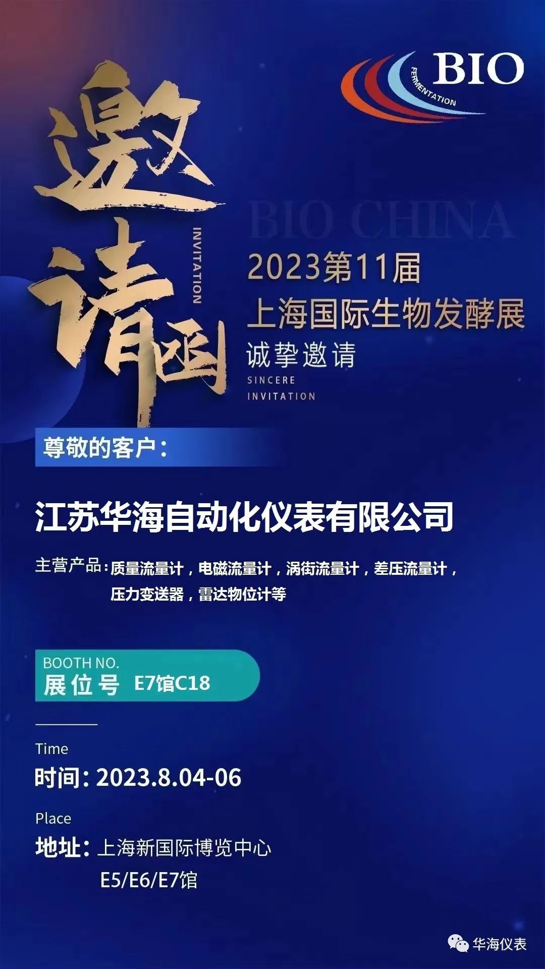 2023第11届上海国际生物发酵展于8.4-6号在上海成功举办,华海测控又一次与您见面了!展位号:E7 C18