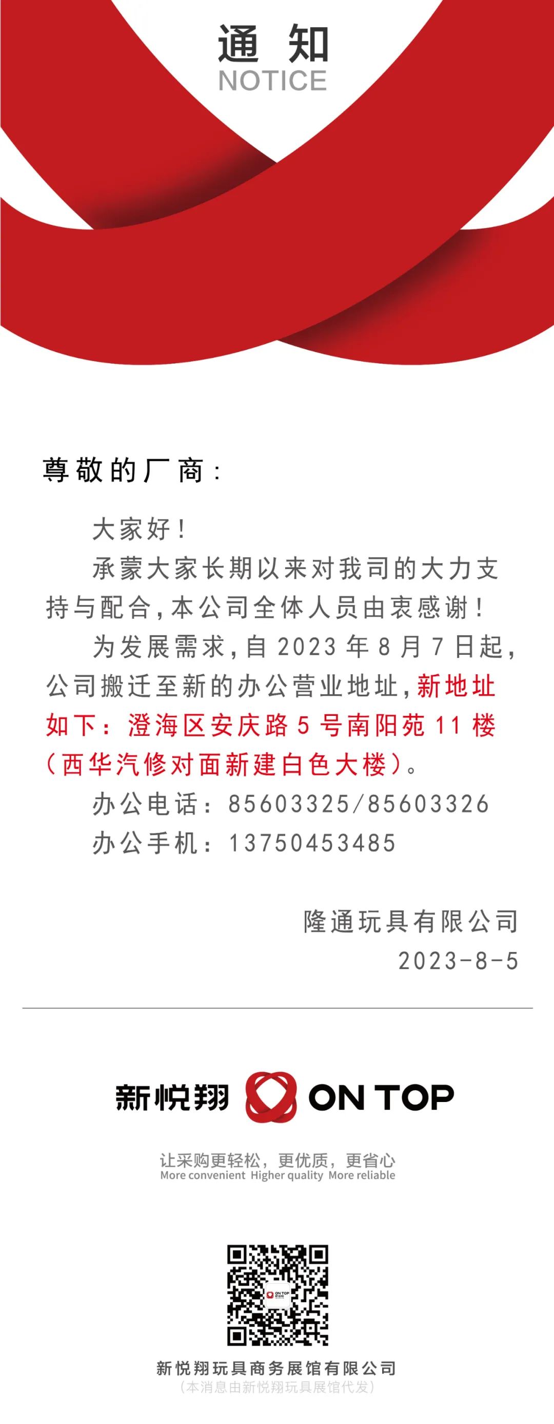 隆通玩具有限公司乔迁通知