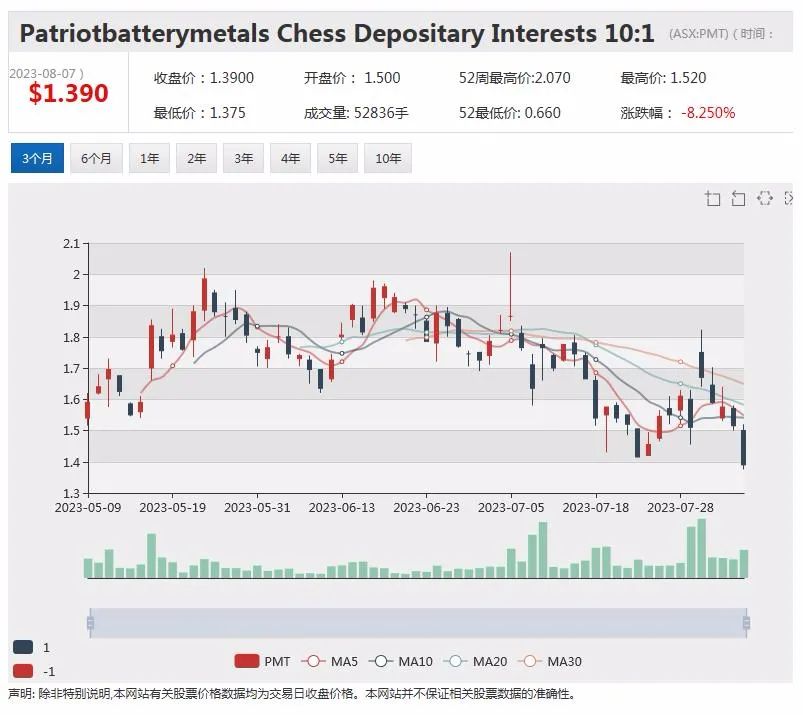 公告发布后,Patriot Battery股价上周五午盘下跌。12:34成交价为1.525澳元,下跌0.05澳元,跌幅3.18%。该股近一年的投资回报率为154.17%。