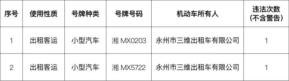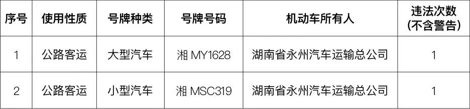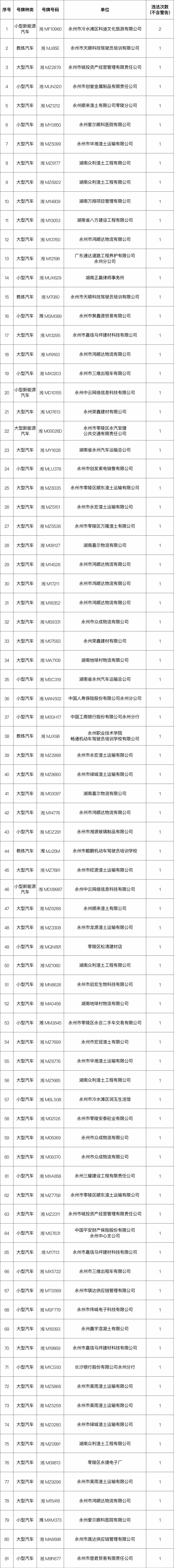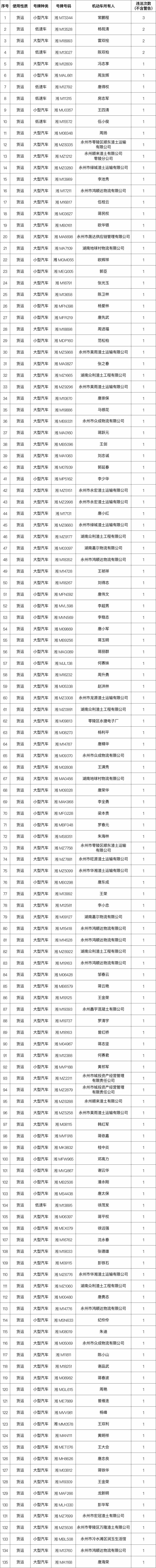 为进一步深化道路交通问题顽瘴痼疾整治,推进交通事故预防“减量控大”工作,创建全国文明城市,营造安全文明、畅通有序的道路交通环境,永州公安交警根据近期中心城区交通安全情况,通报曝光2023年7月31日至8月6日中心城区交通违法的企业、单位及车辆。
