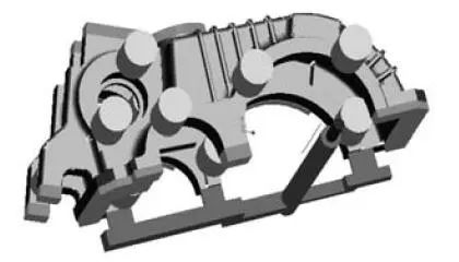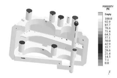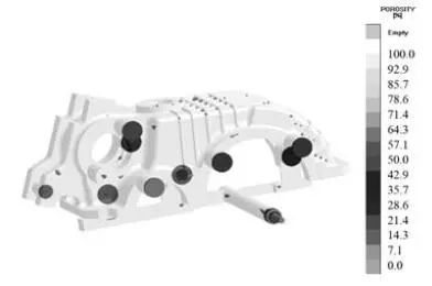 图6-7为齿轮箱凝固场CAE分析,通过对铸件热节、缩松分布图分析,通过对箱体的不同部位设置冒口和冷铁,控制金属液凝固过程,使箱体重要部位均无缩松缺陷,满足质量要求。