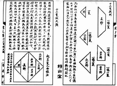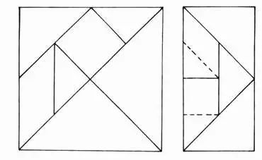 到了清初,燕几图和蝶几图逐渐演变成了七巧图。通过观察我们可以看到,把上图左边完整的蝶几图取右半部,再切割两刀就成了我们现在熟悉的七巧板了。