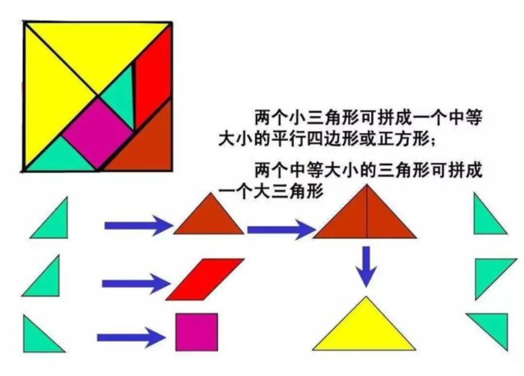 拼合七巧板能帮助孩子认识几何形状、大小、长短,也可以帮助孩子理解图形的组合、分割和代换。七巧板的玩法很多,但不管是依图成形,还是自创图形,都需要小朋友充分转动大脑,去观察、去思考,在玩的过程中,孩子们的观察能力和想象力也会得到提高。
