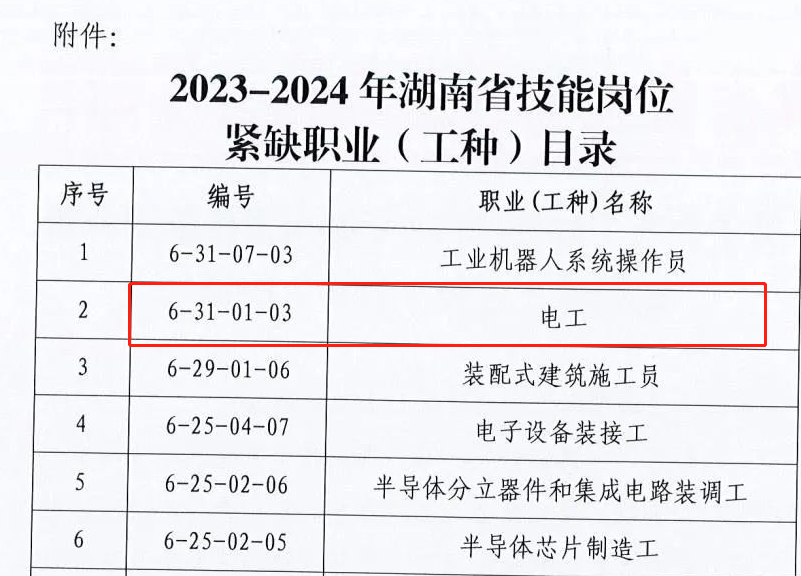 根据2023-2024年湖南省技能岗位紧缺职业(工种)目录,电工“榜上有名”。