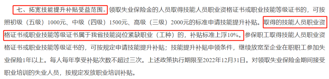 在《稳岗位提技能保就业十六条措施》的通知中第七条内容有提到”取得的技能人员职业资格证书或职业技能等级证书属于我省技能岗位紧缺职业(工种)的,补贴标准上浮10%。”