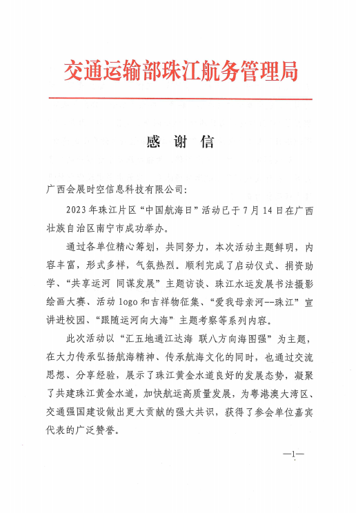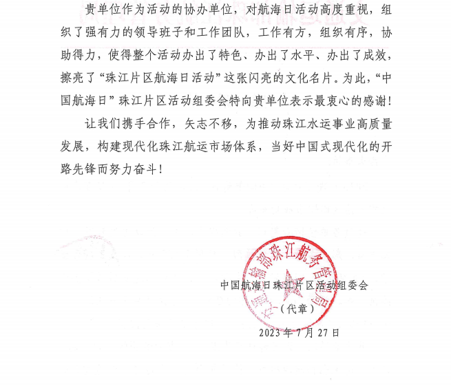 近日,交通运输部珠江航务管理局发来感谢信,以书面形式再次肯定了会展时空公司的专业策划、科学统筹、周密执行能力,对会展时空公司以高质量的服务有效保障整个活动办出特色、办出水平、办出成效,进一步擦亮“珠江片区航海日活动”这张闪亮的文化名片表示衷心感谢。