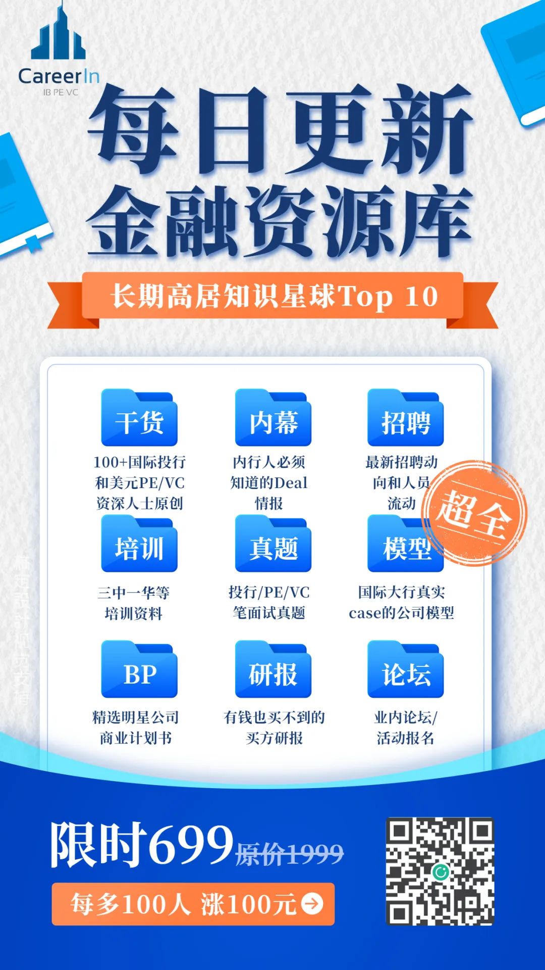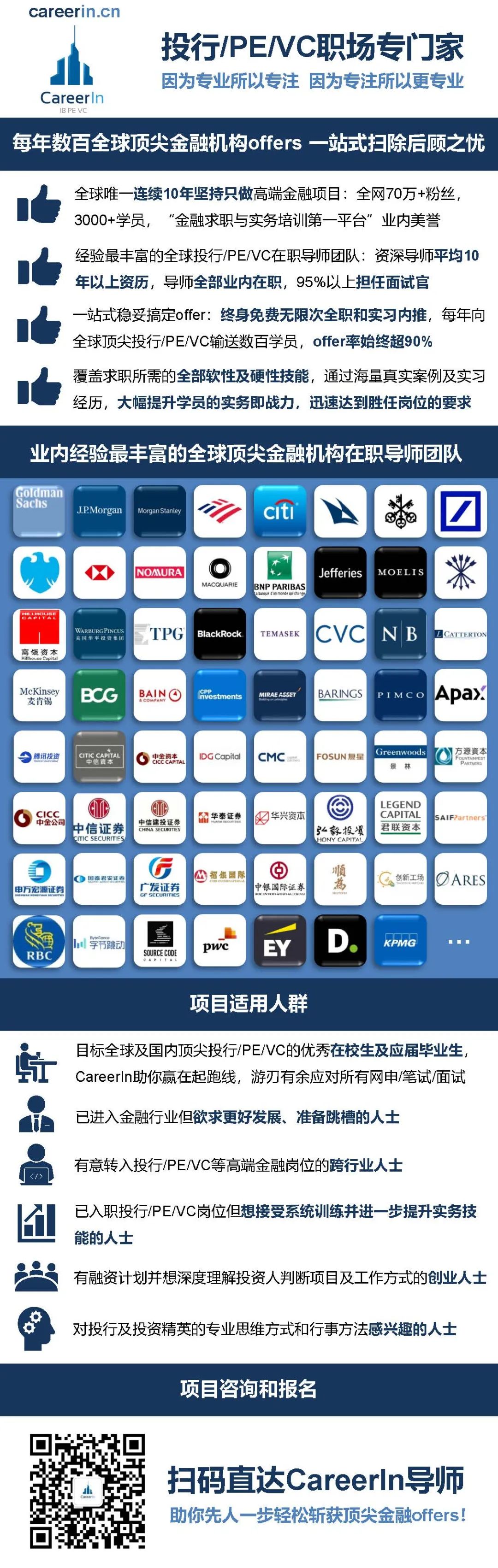 版权声明:CareerIn除发布原创干货以外,致力于优秀投行/PE/VC文章精选、精读。部分文章推送时未能与原作者取得联系。若涉及版权问题,敬请原作者联系我们。联系方式:微信instructor77