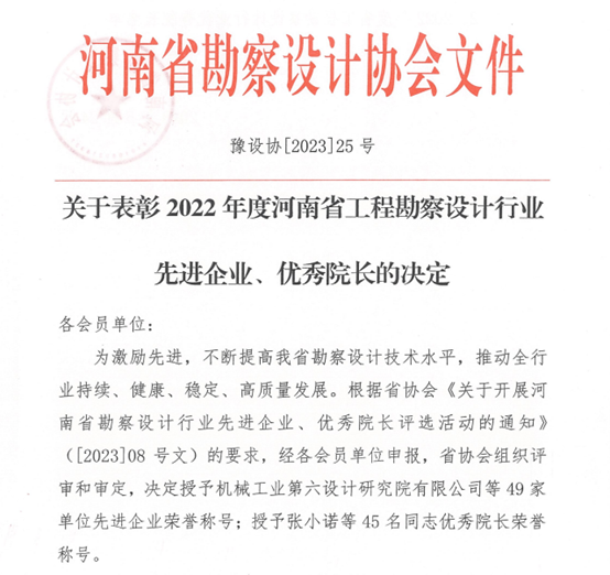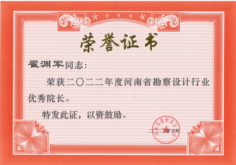近日,河南省勘察设计协会发布《关于表彰2022年度河南省工程勘察设计行业先进企业、优秀院长的决定》,公司荣获“2022年度河南省勘察设计行业先进企业”称号,公司董事长翟渊军同志被评为“2022年度河南省勘察设计行业优秀院长”。