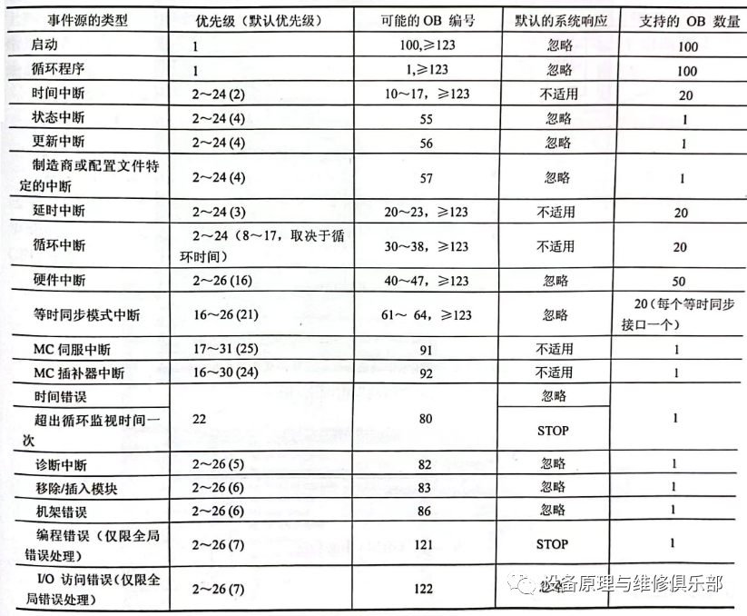 执行一个组织块OB的调用可以中断另一个OB的执行。一个OB是否允许另一个OB中断取决于其优先级。SIMATIC S7-1500 PLC 支持优先级共有26个,1最低,26最高。高优先级的OB可以中断低优先级的OB。例如OB10的优先级是2,而OB1的优先级是1,所以OB10可以中断OB1。S7-300/400 CPU支持优先级有29个。