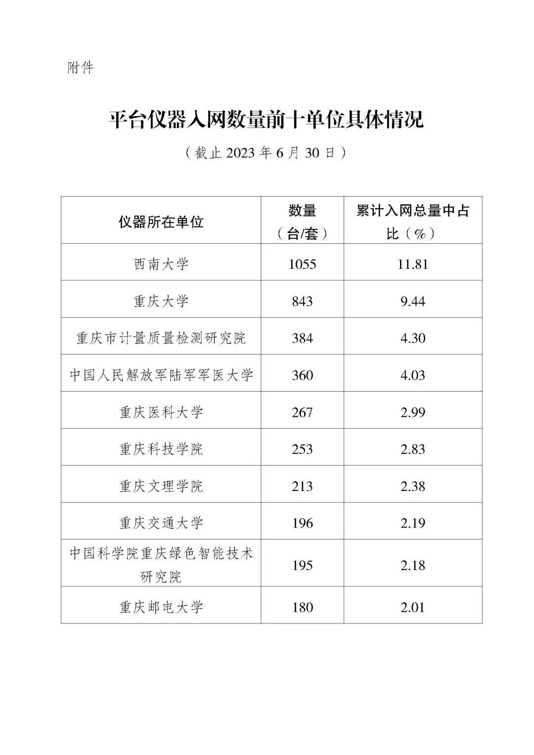 按照《国务院关于国家重大科研基础设施和大型科研仪器向社会开放的意见》(国发〔2014〕70号)精神及《重庆市科技资源开放共享管理办法》(渝科委发〔2016〕127号)相关要求,市科技局持续推进大型科研仪器设备开放共享工作,现将2023年上半年仪器入网情况通报如下: