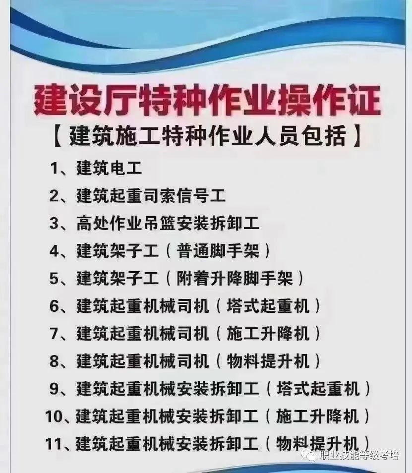 施工升降机,建筑起重司索信号工,塔式起重机,建筑电工,架子工,建筑焊工,安拆等