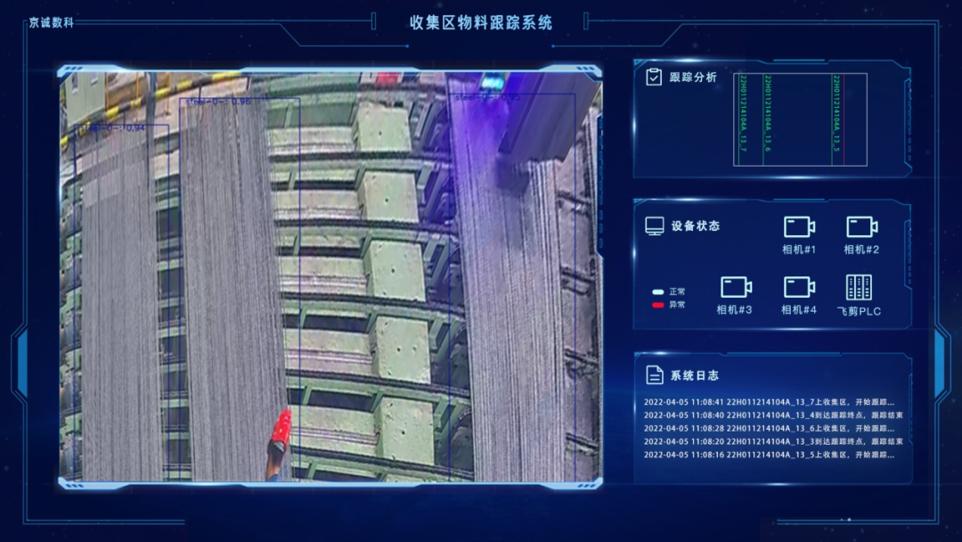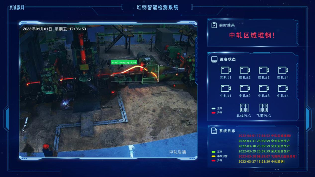 当长材生产发生堆钢事故时,尤其在发生飞钢时将需要停机进行处理,严重影响生产作业率。系统采用工业相机对机架区域和活套进行监控,并基于自主开发的算法对轧机间及其前后区域和活套的图像帧进行实时分析,并结合自主开发的产线预警诊断专家系统,实现堆钢预警和堆钢报警,并与PLC控制系统进行联动,当系统判断出堆钢趋势后,由飞剪启动碎断,避免发生事故,显著提高生产作业率。