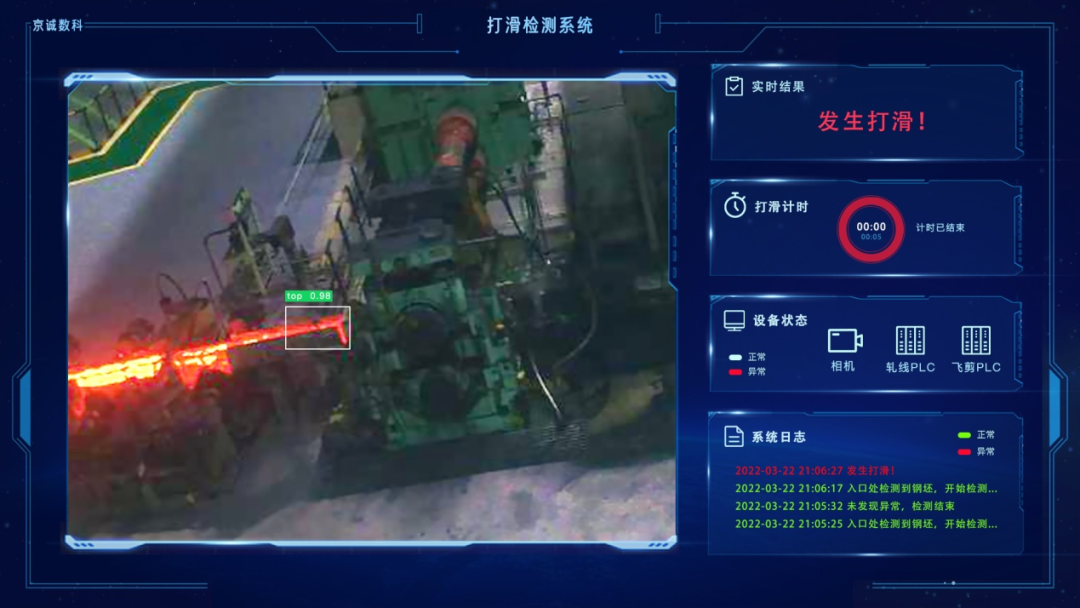 在长材生产过程中,钢坯在粗轧咬入时打滑现象偶有发生,且随着生产集控的推广,发生钢坯打滑时,操作员难以及时发现并处理。系统采用工业相机对粗轧入口区域进行监控,并基于自主开发的算法对钢坯的咬钢图像帧进行实时分析,快速检测出钢坯打滑情况,并及时通知生产人员进行干预,显著降低操作人员的工作强度,提高异常处理的及时性。