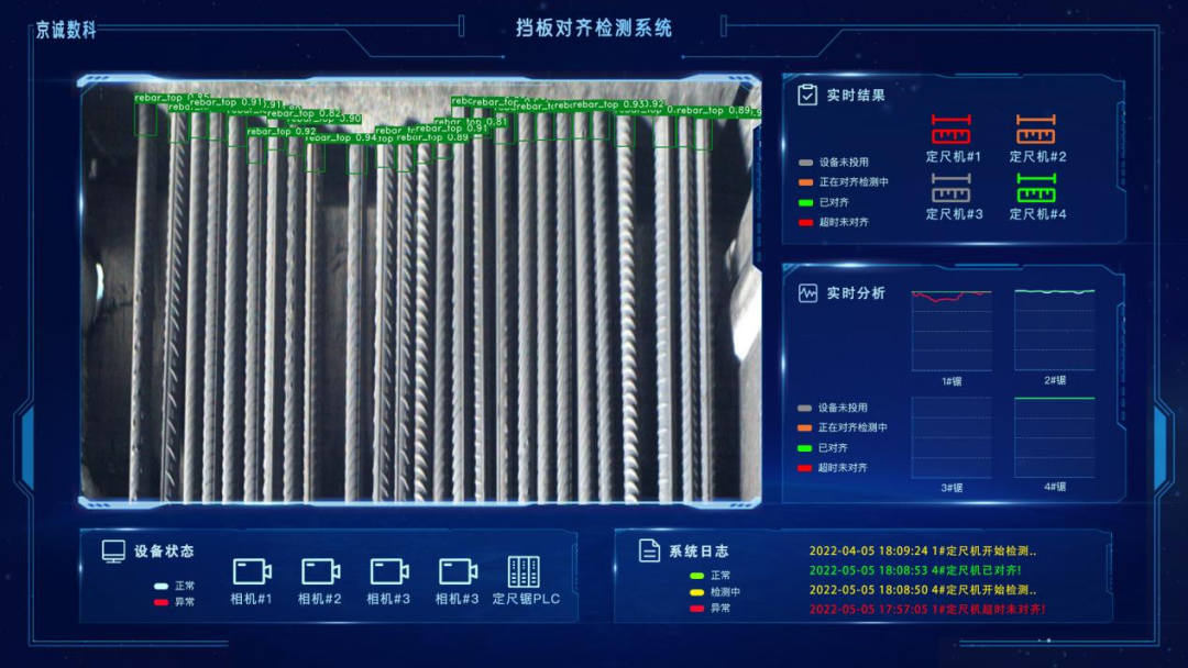 棒材生产过程中,在定尺挡板撞齐的工艺位置,由于无法进行实时自动地对齐状态检测,导致剪区无法实现全自动运行,必须依靠人工目测和现场指挥。系统通过机器视觉+AI的方式实时检测棒材的对齐状态,确认是否完成对齐,并将识别结果实时传送给PLC控制系统,实现对倍尺来料的自动剪切,提高剪切线生产节奏,降低由于头部未对齐剪切导致的短尺问题,解决了制约该工艺段自动化生产的瓶颈问题。