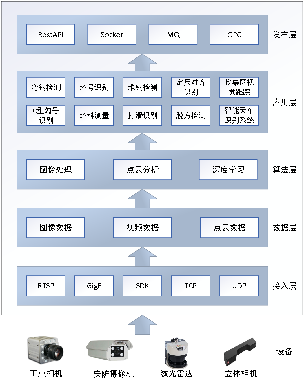 中冶京诚机器视觉智慧感知平台基于边缘端技术构建机器视觉智慧应用,在现场应用端打造“硬件+软件+算法”的一体化成套边缘端机器视觉产品,实现硬件标准化、软件模块化和算法定制化。其中,硬件包括图像采集设备(工业相机、安防摄像机、激光雷达、立体相机等)和存储、计算、网络等基础资源,软件包括异构设备接入、多源数据(图像、视频、点云等)预处理、分析结果发布、识别控制指令下发、数据本地化等核心支持功能,算法指包括图像处理算法、深度学习算法、点云分析算法等用于在特定业务场景下进行视觉识别的核心计算功能。平台采用模块化设计理念进行内核开发,支持进行应用层的二次开发,定制化实现机器视觉在特定场景下的应用。
