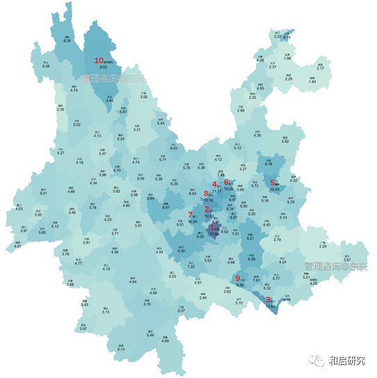 TOP10居然是:红塔、安宁、河口、五华、麒麟、盘龙、易门、西山、个旧、香格里拉