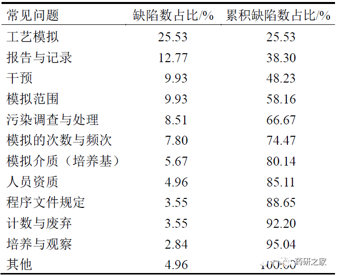 目前,WHO、欧盟、PIC/S 新修订(尚未实施)的无菌药品附录对无菌工艺模拟试验有了更详细的规定,在原有规定的基础上细化了需要特别关注的关键生产步骤,明确了干预操作的设计要点,强调了无菌工艺模拟试验方案制定时需要考虑的内容,突出了对无菌操作人员参与无菌工艺模拟试验的要求和监督,阐述了对废弃物料、灌装单元剔除的原则。除GMP 外,针对无菌工艺模拟试验,部分药品监管机构和行业组织还颁发了多份技术文件、指南就如何做好无菌工艺模拟试验进行更详细的说明,如我国药品监管部门颁布的《无菌工艺模拟试验指南(无菌原料药)》和《无菌工艺模拟试验指南(无菌制剂)》[1-2],美国注射剂协会(PDA)发布的《无菌灌装产品工艺模拟》(TR 22)[3]、《无菌原料药工艺模拟验证》(TR 28)[4]和《手工无菌工艺的建议》(TR 62)[5]等。在针对无菌工艺模拟试验的检查中,检查员需要熟知GMP 的规定,掌握无菌工艺模拟试验常见风险点,了解相应技术文件和指南的内容。对于非最终灭菌的无菌产品,无菌工艺模拟试验是全球药品检查中的重点内容。本研究对近5 年来各主要国家/地区药品监管机构(包括我国国家药品监督管理局、美国食品药品监督管理局、欧洲药品质量管理局等)和WHO 在全球药品生产企业检查中针对无菌工艺模拟试验提出的部分缺陷进行了收集和整理,通过对总计近150个缺陷的统计分析,识别出当前药品生产企业在无菌工艺模拟试验方面的问题分布情况和典型问题,见表2。从无菌工艺模拟试验的最常出现问题的环节进行统计分析,其中累计占比80%以上的缺陷按缺陷出现频次依次为工艺模拟、报告与记录、干预、模拟范围、污染调查与处理、模拟的次数与频次、模拟介质等7个方面。表2 无菌工艺模拟试验检查缺陷分布
