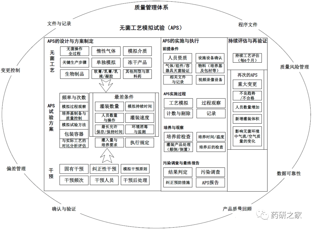 核心的问题是未能有效模拟实际生产工艺,包括对实际生产工艺、最差条件模拟2个方面。对实际生产工艺模拟中典型的问题是无菌工艺模拟的操作未能包括实际生产工艺中可能影响无菌性的关键操作或增加了实际生产工艺中没有的有利于提高无菌保证的操作,如实际生产中需倾斜药液盛放用铝桶、人员手工振摇配液袋底部残留药液、无菌链接、无菌转移、额外的清洁消毒等。最差条件模拟的典型问题主要集中在未能模拟实际生产中的最差条件,如加胶塞次数、各工序持续时间、批量、停机时间和停机次数、人员数量和工作时间等。典型问题包括:(1)无菌工艺模拟试验记录内容不完整,如未记录开关门等干预操作次数、未记录时间模拟最长时间、未记录具体操作人员(包括维修人员)、未记录培养观察支数等。(2)未能提供无菌工艺模拟试验视频录像或提供的未包括全部关键操作和关键信息。(3)验证报告缺失或内容不全面,如细胞培养物接种所用接种物的模拟试验缺少报告、个别报告无明确的验证结论和建议等。典型问题包括:(1)干预操作设计不合理,如多次干预操作集中在短时间内完成;模拟试验中干预次数低于实际生产中的次数。(2)未按方案规定进行干预操作、未建立日常生产过程中干预次数的警戒限。(3)日常生产中未记录干预操作次数(如开门、胶塞上料、将半压塞瓶由灌装机转移到冻干机进行装卸等),确保干预次数小于模拟试验中的干预次数,为后期模拟试验方案设计提供依据。典型问题包括:(1)无菌工艺模拟试验未涵盖无菌操作全过程,如未包括原液除菌滤过后的储存和转移,未包括无菌混合后装瓶密封、暂存、流转的过程等。(2)对生物制品上游无菌生产工序未考虑进行必要的无菌工艺模拟试验,如细胞库、种子批的制备、扩增。(3)无菌工艺模拟试验未包括全部生产线、生产设备或产品规格,如两条生产线仅对其中一条进行无菌工艺模拟试验、2个包装规格的产品仅进行了1个规格产品的模拟验证。典型问题包括:(1)程序文件或方案中未对无菌工艺模拟试验出现污染时如何进行调查与处理进行规定。(2)对已发生的污染调查与处理不充分,如未对每瓶污染的微生物进行鉴别、对调查判断的原因缺少证明性或支持性数据、调查发现日常生产中的1个常规性干预操作会导致污染时未进行召回评估,也未通知监管部门。典型问题包括:(1)未按GMP 规定每班次每半年至少进行1 次无菌工艺模拟试验,如1条生产线上有两台冻干机交替使用,但每半年仅对其中一台冻干机进行无菌工艺模拟试验;某生产线正常生产,但最近1 次无菌工艺模拟试验时间为1 年前;每年仅进行1 次无菌工艺模拟试验,且缺少任何分析评估。(2)未进行至少3 次合格的模拟试验,如上游工序无菌操作仅进行了1 次合格的模拟试验。(3)发生重大变更、偏差的情况下,未开展必要的无菌工艺模拟试验。典型问题包括:(1)培养基促生长试验开展不规范,如未在促生长试验中考察金黄色酿脓葡萄球菌和铜绿假单胞菌、促生长试验的培养温度与模拟灌装培养温度不一致、在培养结束后未进行培养基促生产试验(仅在开始培养前进行了促生长试验)。(2)培养基的使用缺少必要的评估和确认,如常规情况下半压塞后放置冻干机时间约38 h,未评估该过程培养基脱水导致不能保证微生物生长的风险;未对使用的培养基有效期进行确认等。(3)模拟介质选择缺少有效评估,如无菌工艺模拟试验中使用生理盐水作为模拟介质,经除菌滤过后进行无菌检测,缺少证明该方式与使用培养基作为模拟介质能达到一致性效果的数据;培养基模拟灌装记录显示充氮保护,但未选用厌氧培养基,而是选用胰酪大豆胨液体培养基(TSB)作为模拟介质。主要包括:(1)人员资质管理薄弱,如无菌操作人员的资质规定不详细、未对参与的工程和质量控制人员进行培训、未考虑实操培训、未能提供无菌连接和断开的实操培训记录、视频中个别无菌操作人员着装不规范等;(2)程序文件规定存在遗漏,如缺少对种子批次、细胞库和接种物制备的无菌模拟试验规定;(3)剔除的小瓶缺少合理的原因说明和记录;(4)培养和观察中存在未监测培养温度、未规定培养前小瓶的最长存放时间等;(5)错误地使用无菌工艺模拟试验替代存放时间验证。基于对GMP、技术指南的分析,结合我国制药行业和检查实践,无菌工艺模拟试验可以从设计与方案制定、实施与执行、持续评估与再验证3 个阶段进行重点分析,具体试验要点参考结构,见图1。